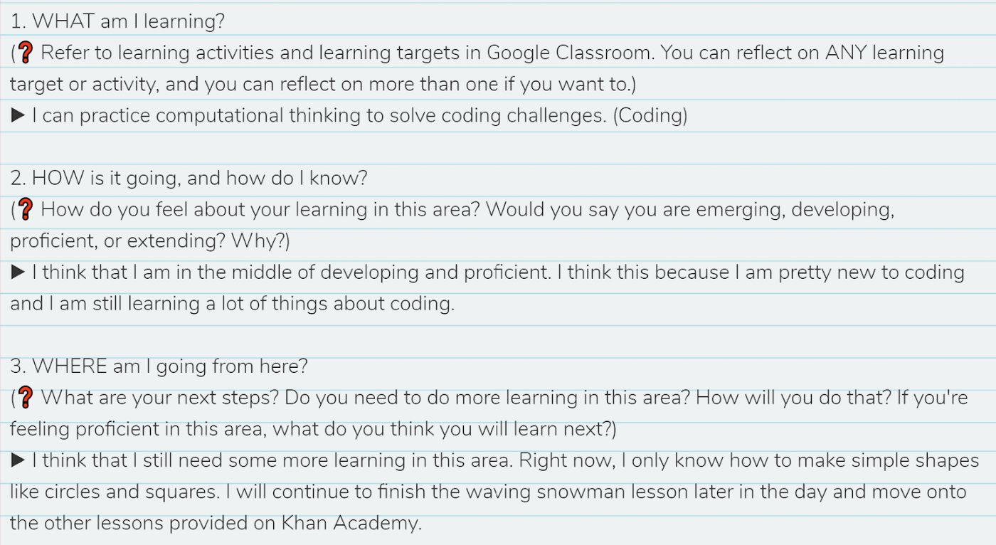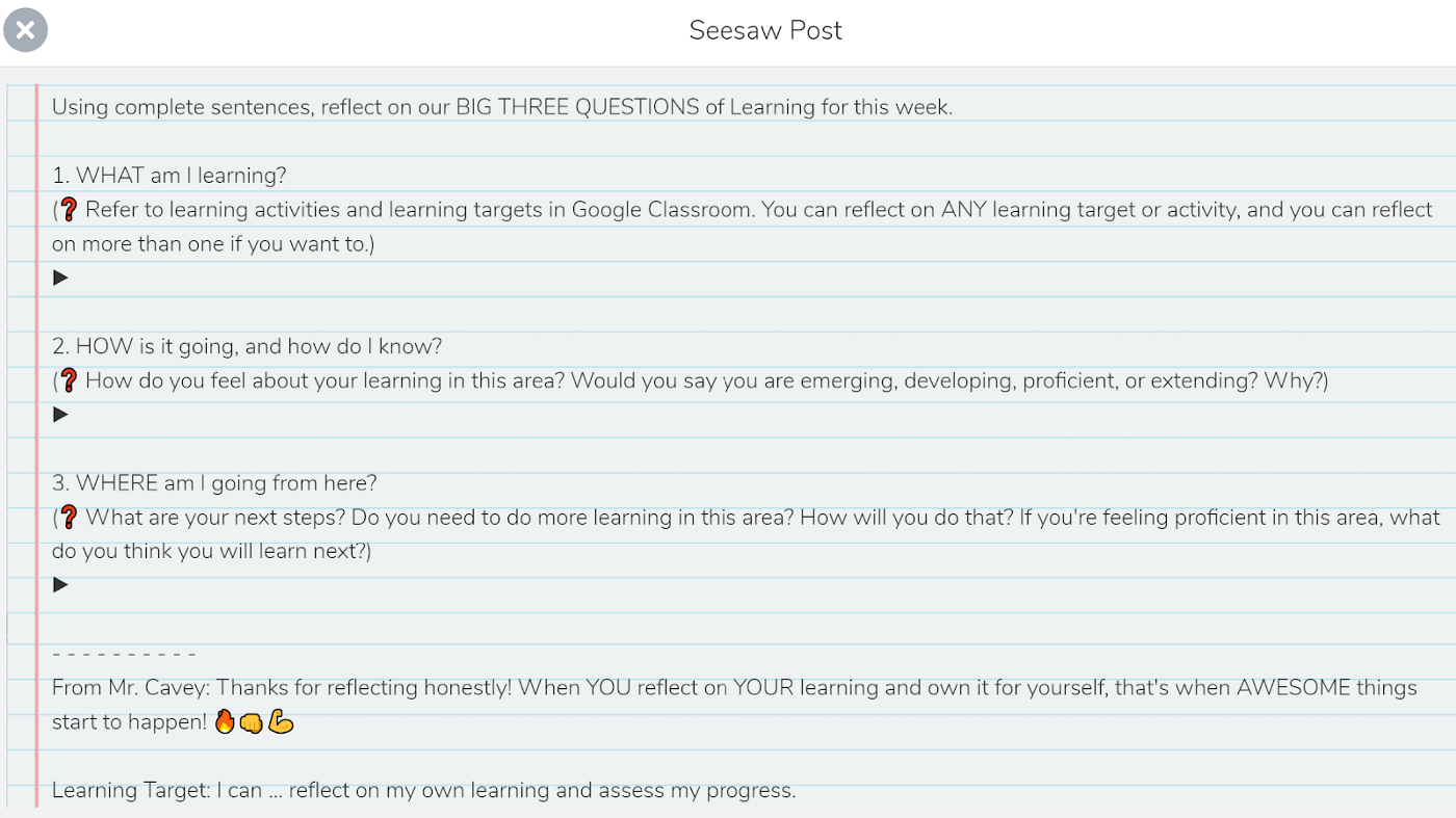 First, I decided to make these Three Big Questions a regular part of my classroom culture. I then asked my 8th grade students (at a different school at the time) to reflect on these questions on Seesaw every Friday.