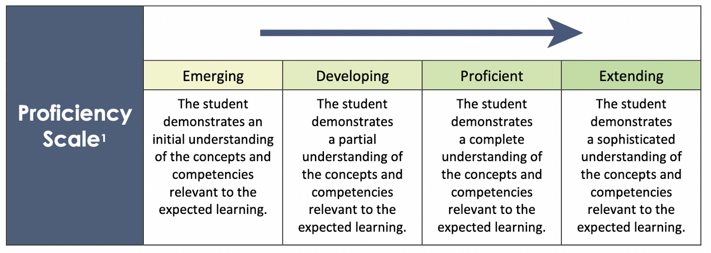 Instead, evidence of student learning is assessed against curricular standards using a 4-point proficiency scale like the one below.