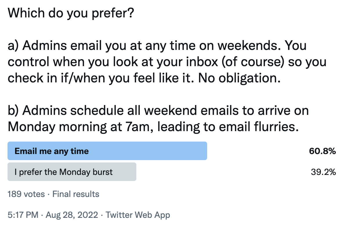 Feeling some doubts around the scheduled email practice, I went to teachers to get a sense of their preference. I posted a poll on Twitter and 189 responded.