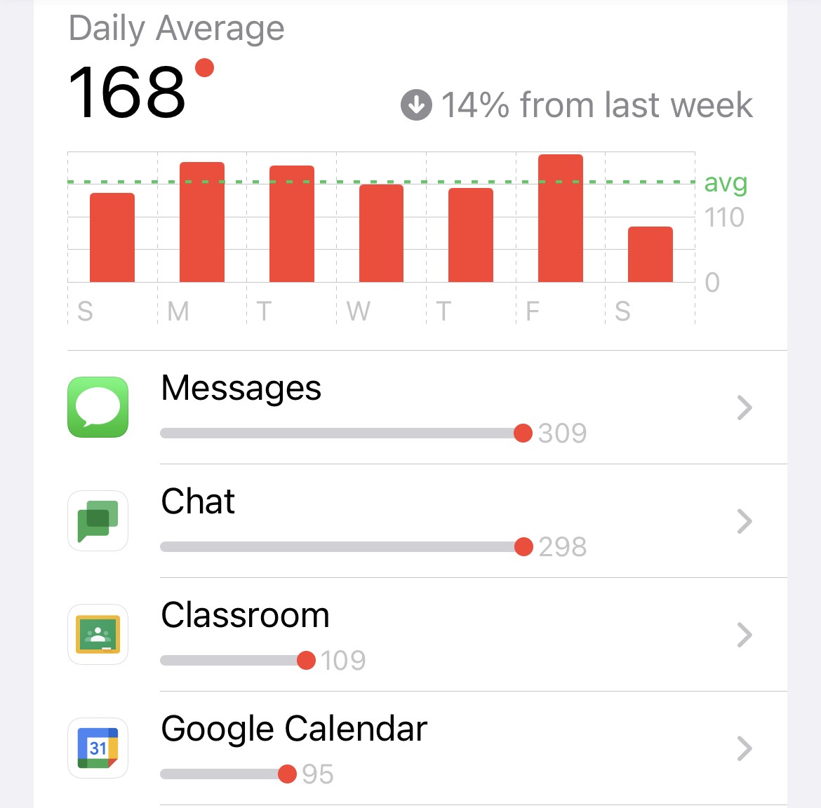 My phone tells me that I’m receiving an average of 168 notifications per day, and the apps pictured below the graph show the number of notifications each one would generate on a weekly basis if I allowed them to.