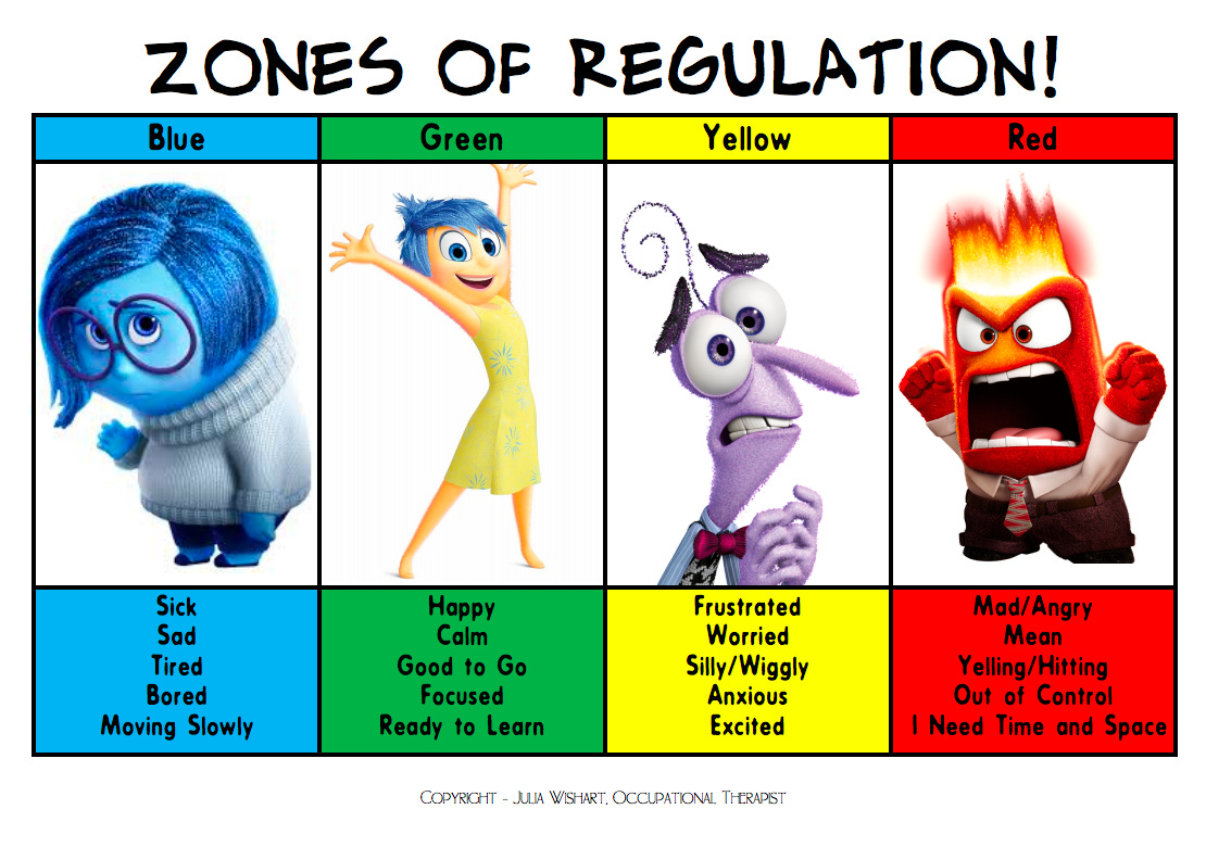 Pixar’s Inside Out (characters pictured above) brought the zones of regulation to life. As helpfully illustrated, the red zone is temporary insanity.