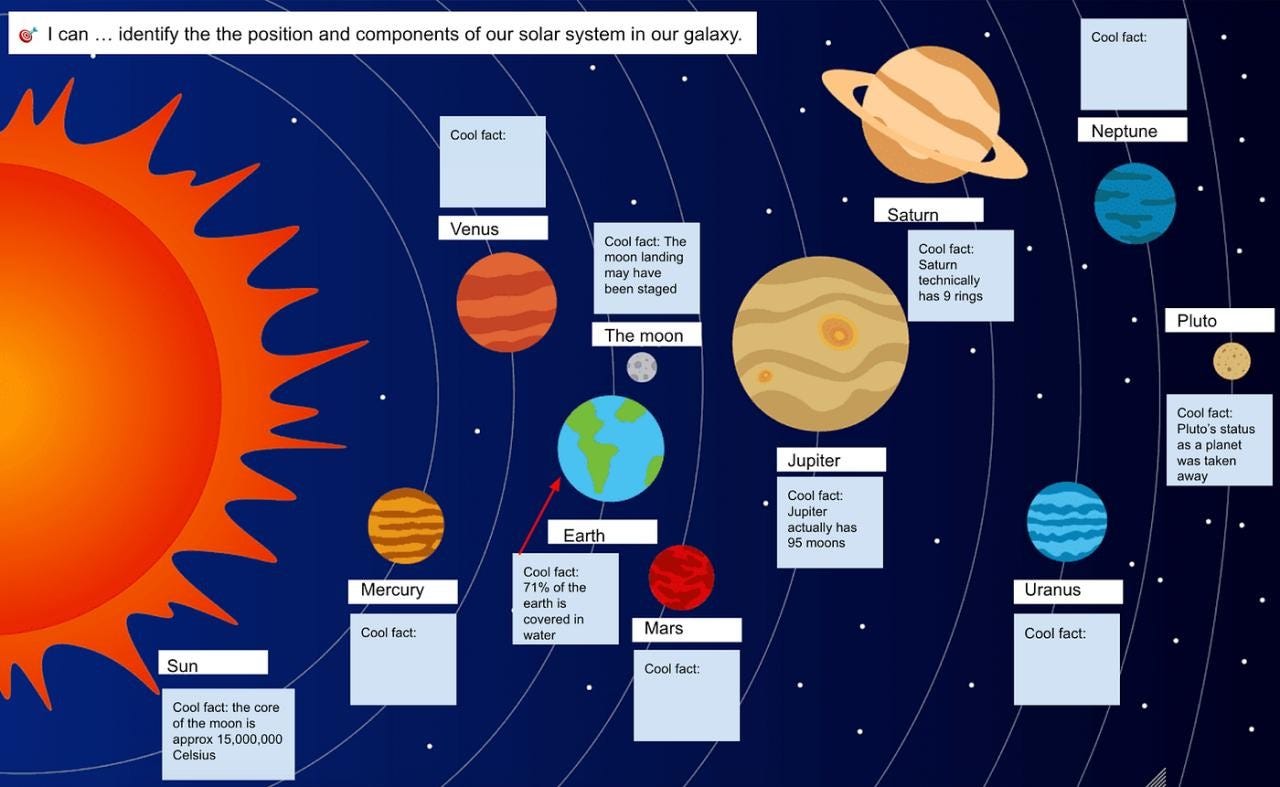 Let’s take this hypothetical learning activity for sixth grade Science students. I’ve asked students to 1) label each planet correctly and 2) use the text box feature to add one interesting fact about each planet, moon, and star.
