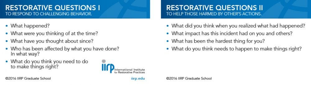 In a sea of great resources available to educators, I’m grateful to the International Institute for Restorative Practices for these practical conversation prompts. I use them with students often.